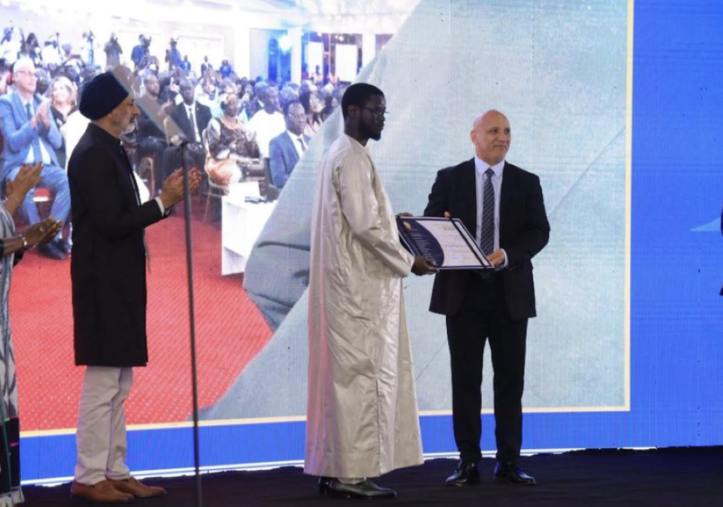 وسلم الرئيس السنغالي باسيرو ديوماي فاي الجائزة إلى البروفيسور حسن الصفريوي، مدير وعضو اللجنة التنفيذية للمؤسسة المغربية للعلوم المتقدمة والإبتكار والبحث العلمي (MAScIR)، خلال حفل إختتام الدورة السابعة لمنتدى “غاليان إفريقيا”، الذي تم تنظيمه خلال الفترة ما بين 22 و25 أكتوبر الجاري بالعاصمة السنغالية.